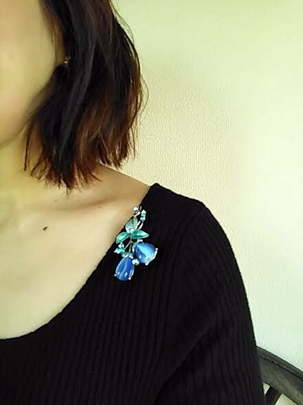 サテンのような美しいブルーの光沢が華やかな表情を醸し出す、大ぶりのフラワーブローチです。