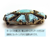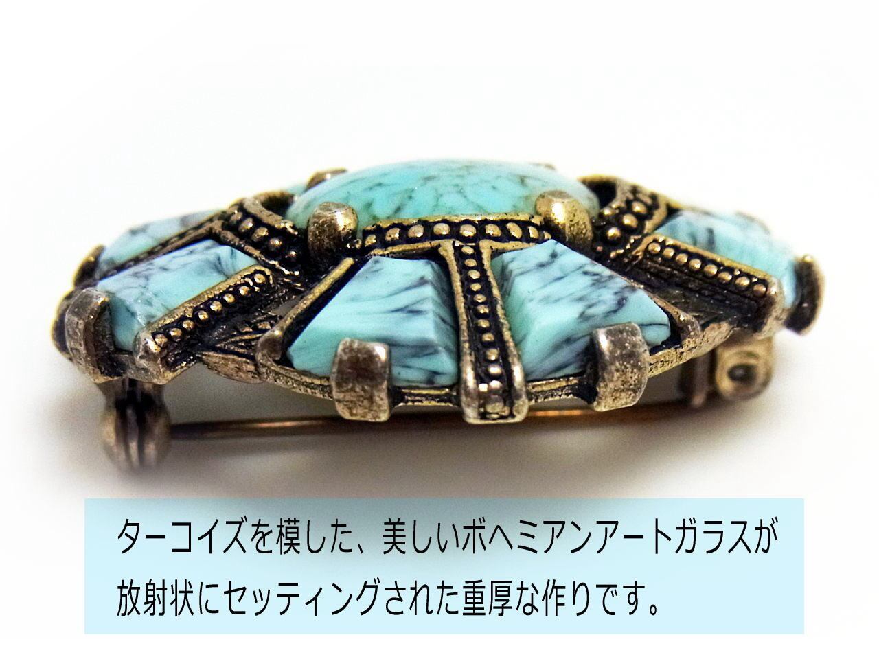 ターコイズを模したスカイブルーのボヘミアンガラスを用いた、ケルティッククロスモチーフのヴィンテージブローチです。