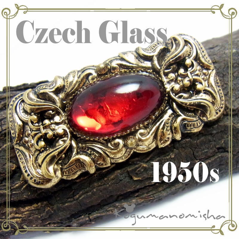 チェコガラス★鮮やかな ルビーレッド カボッション 唐草 プレスメタル ヴィンテージ ブローチ 1950s