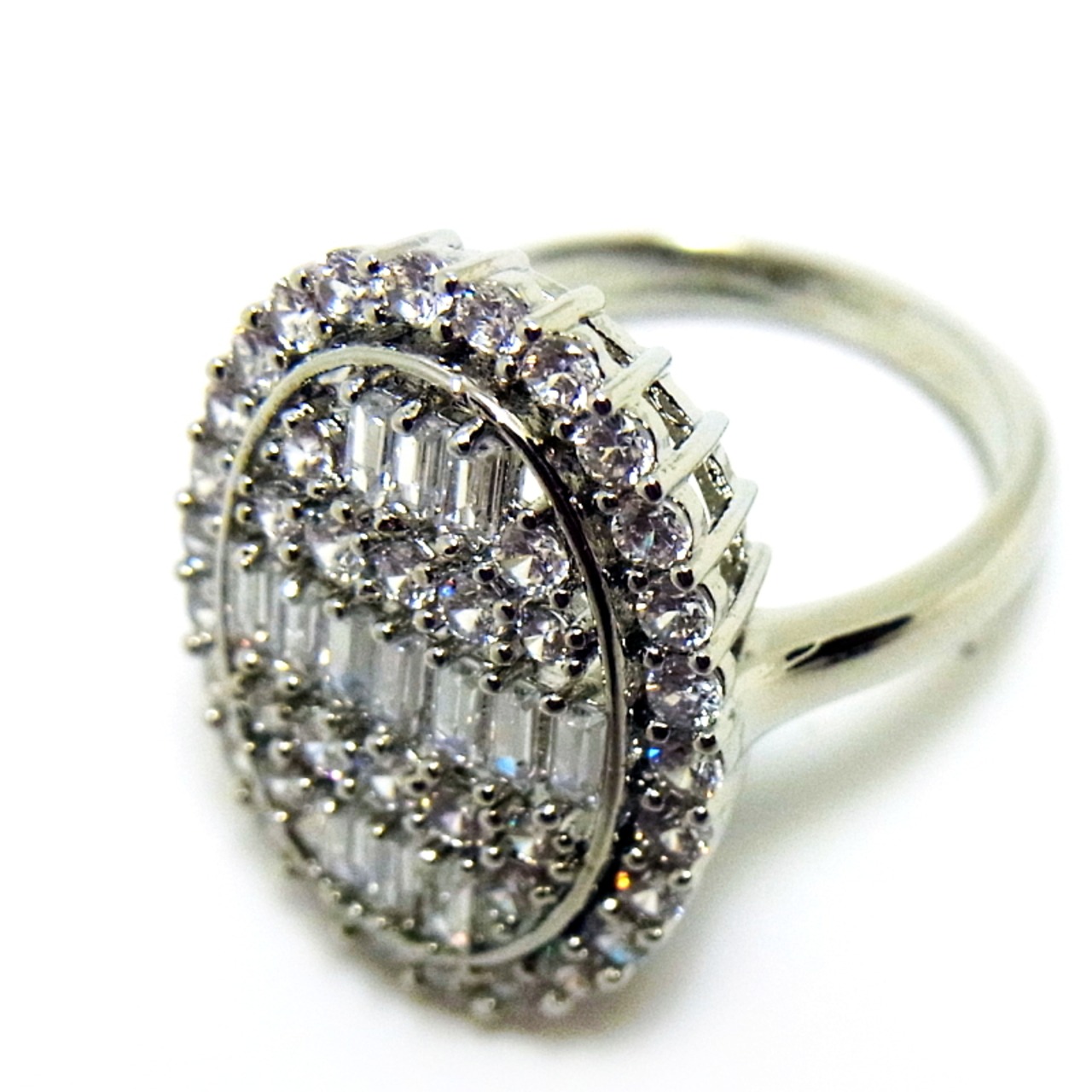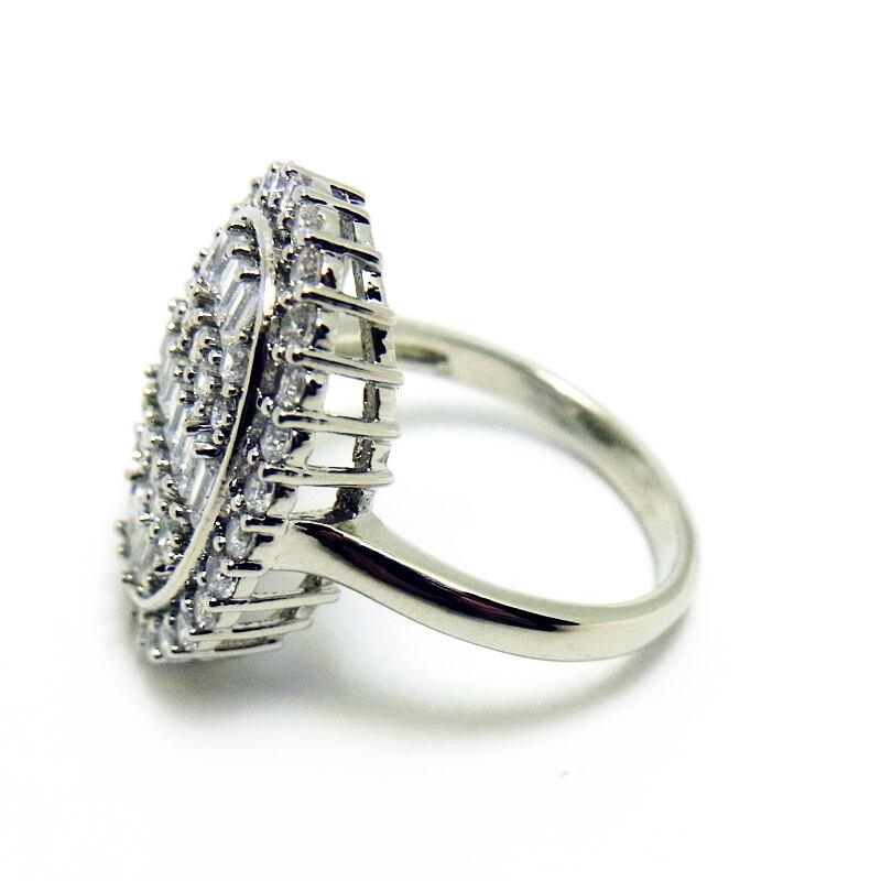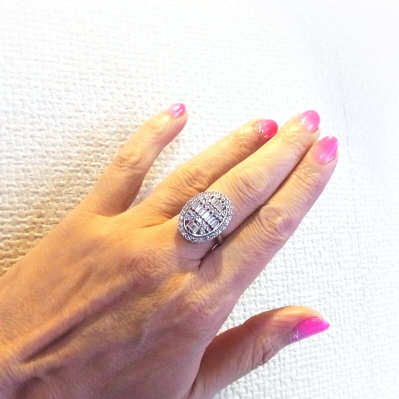 シャープな印象でスッキリとしたバゲットカットのホワイトサファイアが敷き詰められた、とってもおしゃれな大ぶりのオーバルリングです。