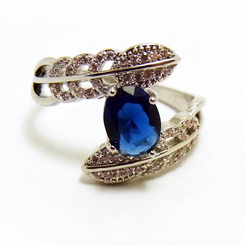 深みのあるコーンフラワーブルーのシンセティックサファィアに、ダイヤモンドの輝きを放つキュービックジルコニアがあしらわれたモダンなデザインリングです。