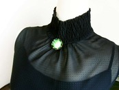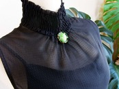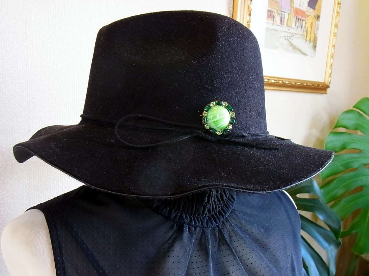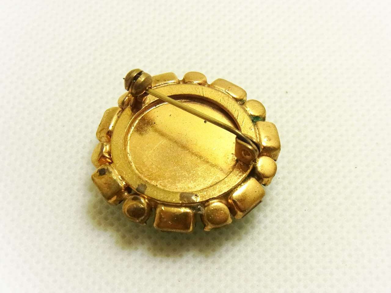 美しいバンデッドグリーンのカボッションガラスに、シャープな輝きを放つエメラルドグリーンのラインストーンが取り巻かれた、アールデコスタイルのクラスターブローチです。