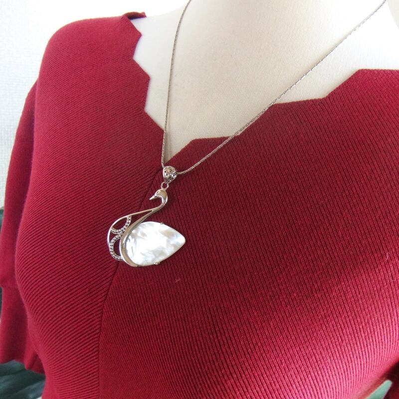 虹色の光彩を放つ、天然シェルの輝きが大変魅力的な大ぶりのペアシェイプシェルを用いた白鳥ペンダントです。