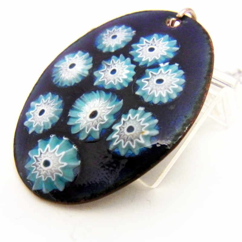 深みのあるコバルトブルーに白いミルフィオリをエフェクトした斬新なデザインのエナメルペンダントです。
