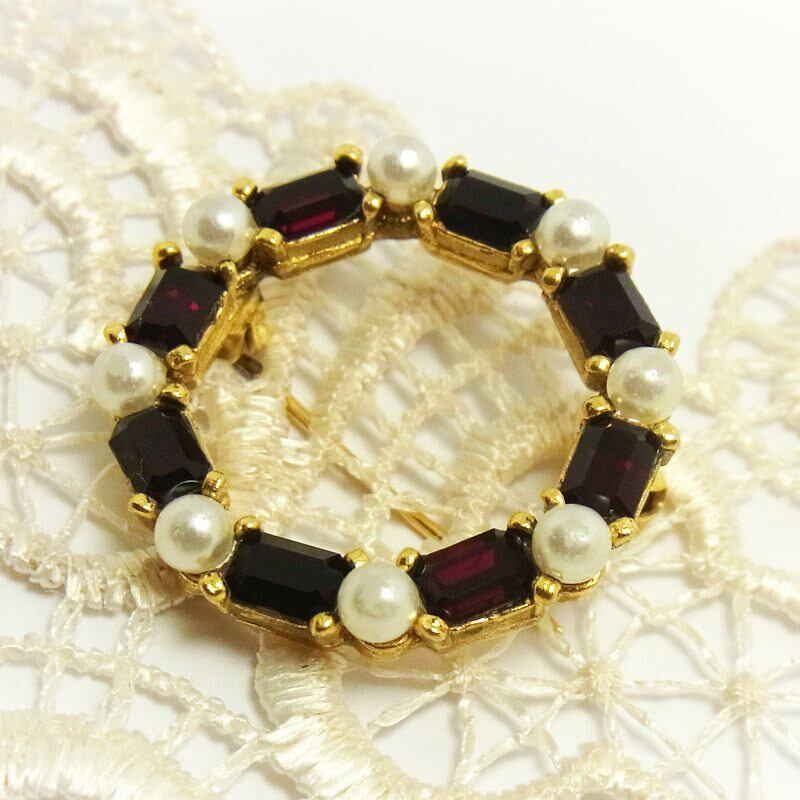 ルビーカラーのラインストーンに上品なパールビーズがあしらわれた、シンプルかつモダンなリース型のヴィンテージブローチです。
