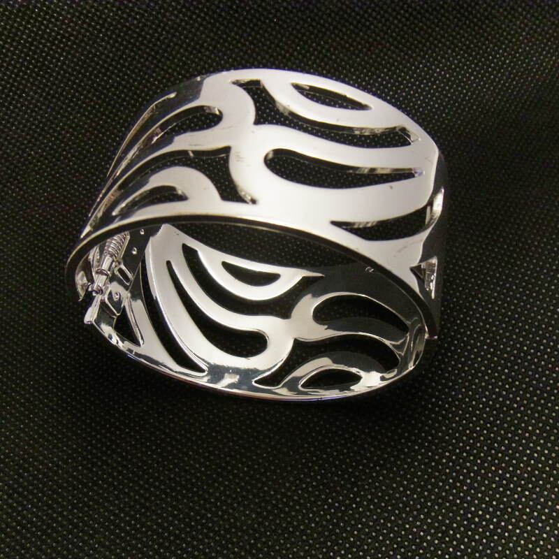 堅牢なシルバープレーテッドメタルを用いた、高級感のある鏡面仕上げのオープンワークがとってもお洒落な幅広バングルです。