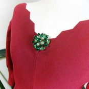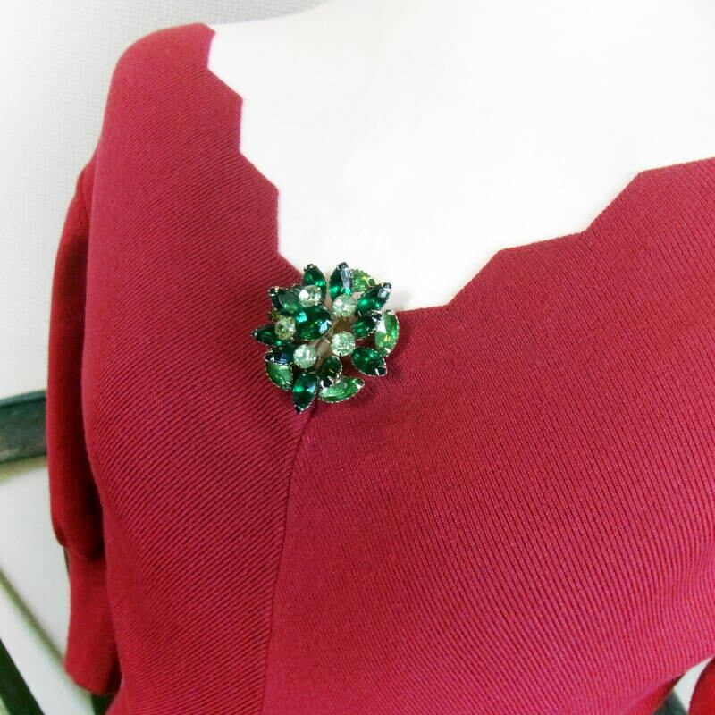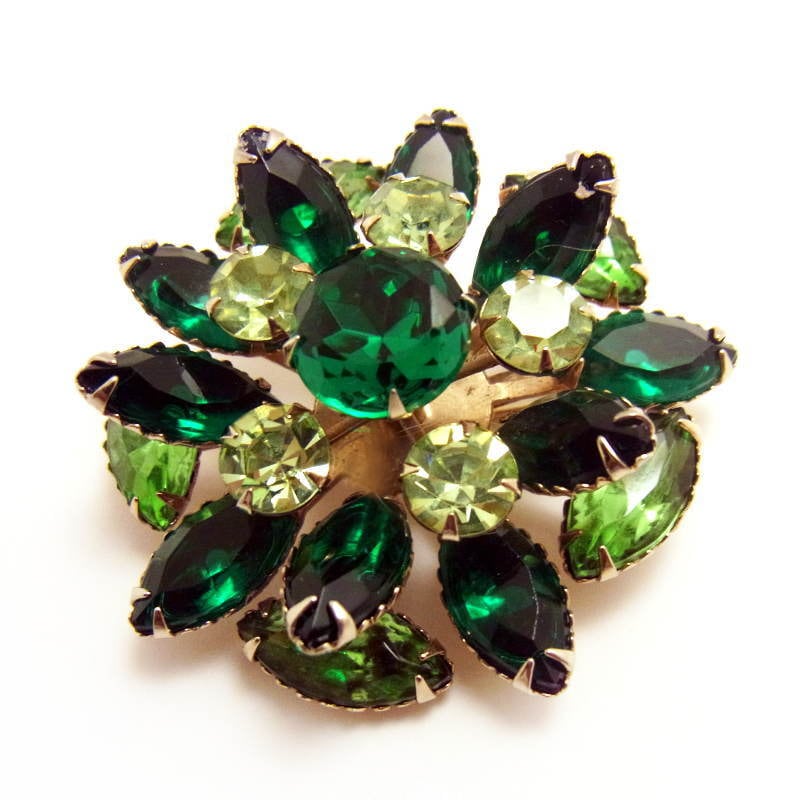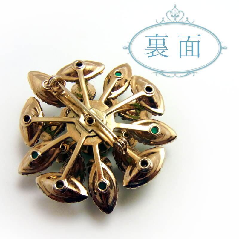照りのあるエメラルドグリーンクリスタルを用いた、エレガントなお花モチーフのヴィンテージブローチです。
