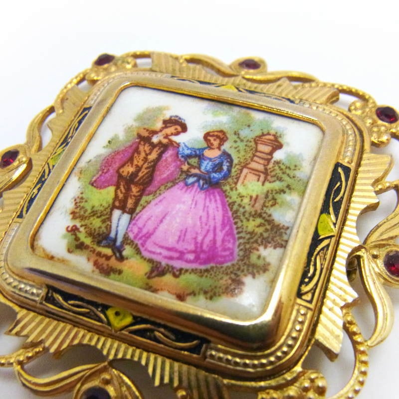 FRAGONARD★リモージュ焼 ロマンチックなカップル画 ラインストーン ヴィンテージ スクエア ブローチ フラゴナール 1950s ロココ調