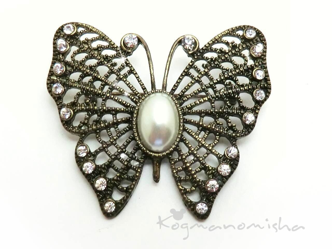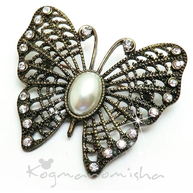 ラッキーアイテム☆ブロンズカラーの蝶 フェイクパール ヴィンテージ バタフライブローチ